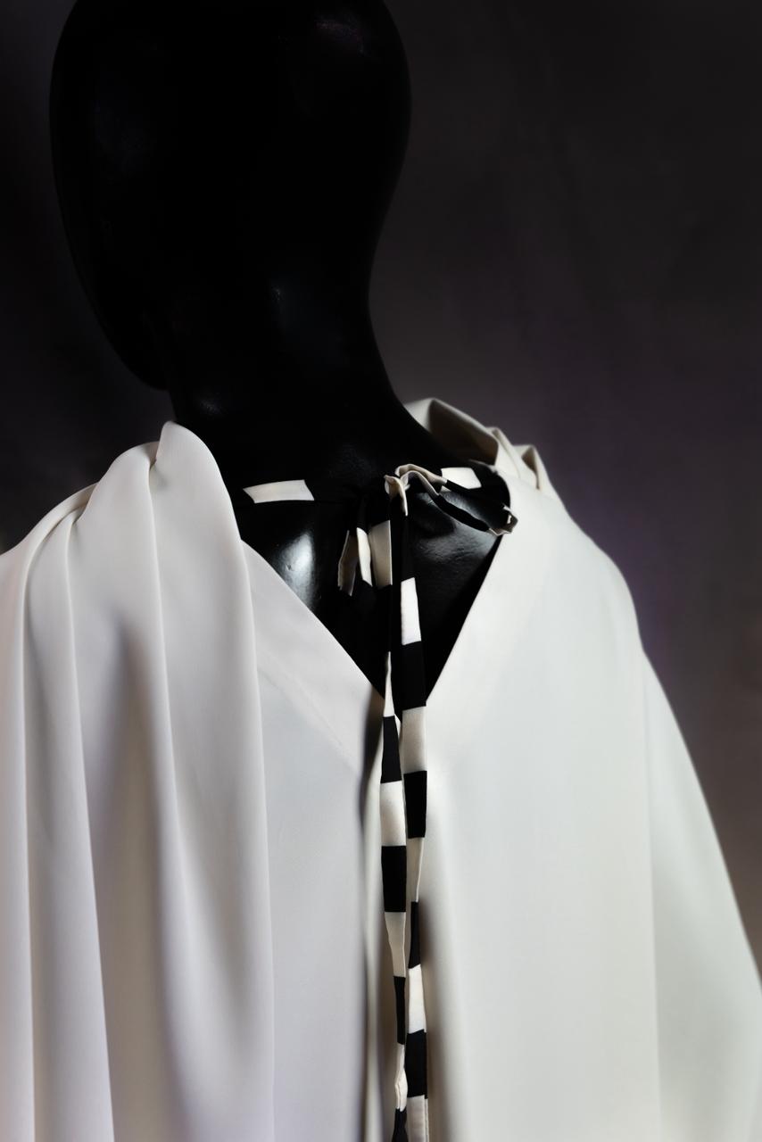 Finished with a bold black striped hem, this piece balances minimalism with contemporary contrast  making it perfect for elevated daywear or evening occasions.