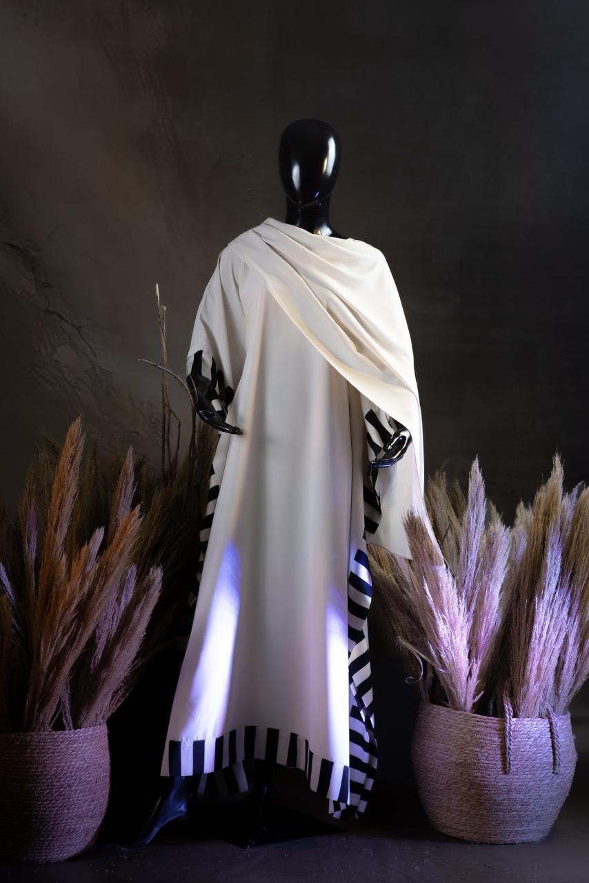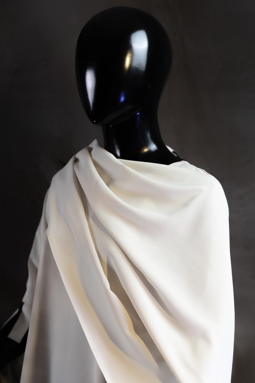 The Ivory Contrast Kaftan is a statement in understated luxury. Designed in a fluid, soft-fall fabric, this silhouette drapes beautifully over the body, creating a look that feels both modest and modern. The attached draped scarf detail flows seamlessly from the shoulder, eliminating the need for separate styling while enhancing elegance.